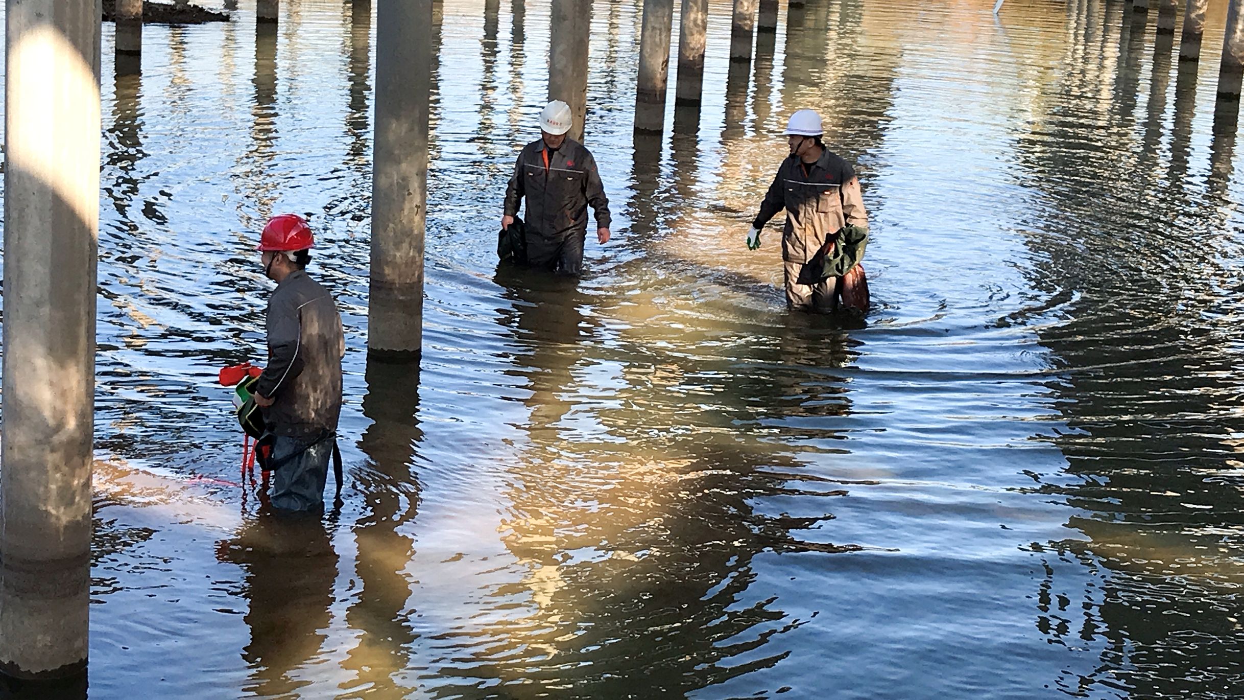 冬季的环圩河寒风凛冽,河水冰冷刺骨,现场出现很多意想不到的困难——由于生产批次不同,更换的组件出现安装孔不匹配,需要重新开孔;有的光伏区没有浮筒平台,只能人力扛着梯子,穿着水裤去更换整修;有的地方淤泥混水太深,队员下水后,冰冷的河水瞬间灌满了水裤,淹没了身上的衣衫,不一会儿全身冰冷,腿脚冻僵。艰苦的工作环境也阻挡不了抢修队员的工作热情和战胜困难的决心,队员坚持把组件更换安装到位。通过三天的不懈努力,电站受损组件修复工作顺利完成。