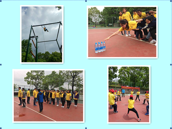 为期一天的拓展训练内容包括“破冰起航”、“群龙取水”、“鼓动人心”、“智力电网”、“高空跳杆”等活动项目。在“群龙取水”比赛中,大家默契十足,合作精神展现的淋漓尽致,通过队友的帮助,冲过重重阻碍,终于成功取水,比赛紧张,扣人心弦;在“鼓动人心”比赛中,队员们统一步调,不断尝试、不断总结、不断进步,团队合作精神贯穿始终;在“智力电网”比赛中,为了集体荣誉,大家精确计算,合理谋划,所有队员不怕脏不怕累,都以十足的拼搏精神全力以赴,活动场上口号声、欢呼声、呐喊声、掌声交织成一片;在“高空抓杆”比赛中,队员们以最大的努力克服心里障碍、发掘自身潜力,冷静面对、挑战自我,深刻体会了团队协作、信任互助和自信的重要性,承受住压力,战胜了困难,用汗水书写了弘扬五四的华彩乐章。
